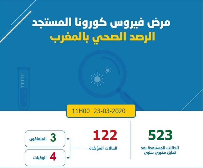 أعلنت وزارة الصحة إلى الرأي العام أنه تم إلى حدود اليوم الإثنين 23 مارس 2020 وإلى غاية الحادية عشر صباحا، تسجيل 7 حالات جديدة بفيروس كورونا ليصل العدد إلى ما مجموعه 122 حالة إصابة مؤكدة بفيروس كورونا المستجد، تم تأكيدها مخبريا بمعهد باستور-المغرب والمختبر الوطني للأنفلونزا والفيروسات التنفسية بالمعهد الوطني للصحة بالرباط، ومختبر المستشفى العسكري.