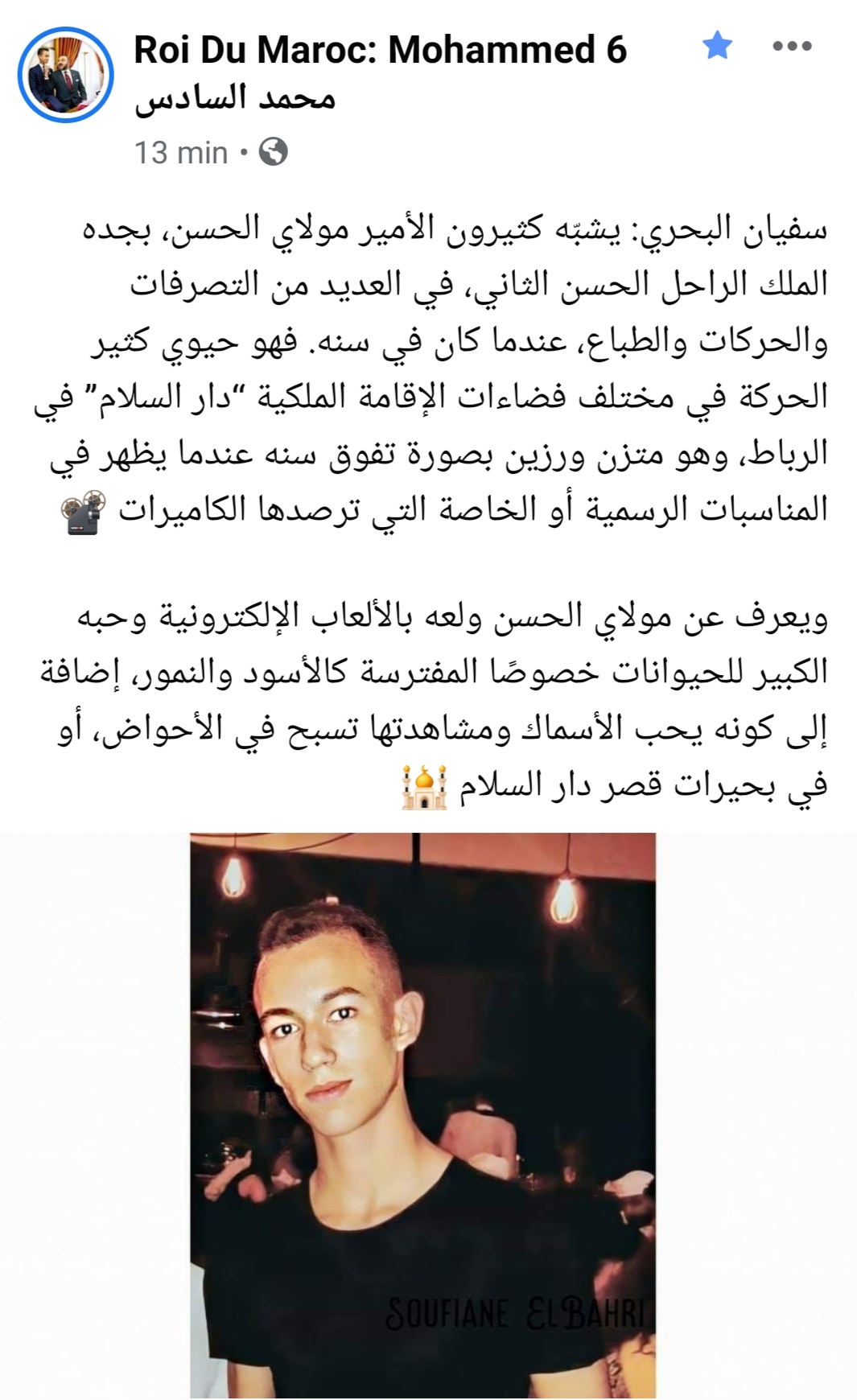 وتابع" البحري" من خلال تدوينة نشرها عبر صفحة الملك محمد السادس التي يتولى إدارتها: "يعرف عن مولاي الحسن ولعه بالألعاب الإلكترونية وحبه الكبير للحيوانات، خصوصًا المفترسة كالأسود والنمور، إضافة إلى كونه يحب الأسماك ومشاهدتها تسبح في الأحواض، أو في بحيرات قصر دار السلام".