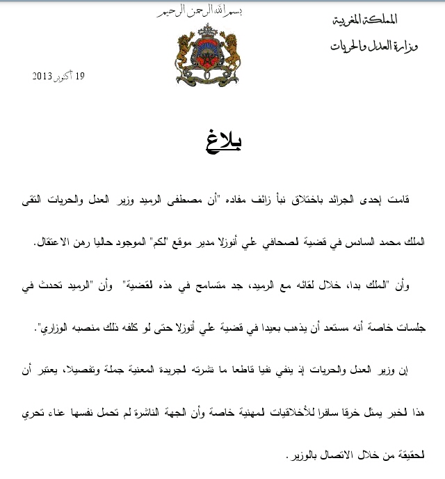 وكان الموقع المذكور قد ادعى أن الملك قد أعرب للوزير عن تفهمه للقضية ونسبت إلى الرميد قوله أنه مستعد للتضحية بمنصبه في سبيل إطلاق سراح أنوزلا.