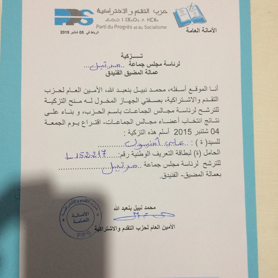 التزكية موقعة من طرف الامين العام لحزب التقدم والاشتراكية نبيل بن عبد الله وبهدا يكون علي امنيول وكيلا رسميا لحزب الكتاب خلال الانتخابات الجماعية المقبلة التي ستجرى يوم 4 شتمبر 2015 ، كما تم انتخابه رئيسا للجنة الترشيحات والانتخابات بحزب التقدم والاشتراكية بعمالة المضيق الفنيدق ..