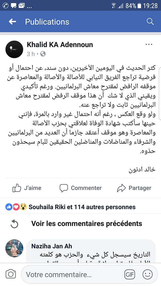و كتب أدنون في تدوينة على حسابه بالفايسبوك :"كثر الحديث في اليومين الأخيرين، دون سند، عن احتمال أو فرضية تراجع الفريق النيابي للأصالة والمعاصرة عن موقفه الرافض لمقترح معاش البرلمانيين. ورغم تأكيدي ويقيني الذي لا شك أن موقف الرفض لمقترح معاش البرلمانيين ثابت ولا تراجع عنه".