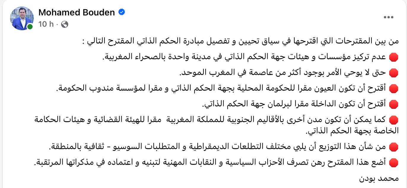 ويضع الأستاذ بودن هذه المقترحات رهن إشارة الأحزاب السياسية والنقابات المهنية باعتبارها أرضية جاهزة يمكن اعتمادها ضمن المذكرات المرتقبة، خصوصًا في ظل السياق الوطني الذي يتجه نحو تعزيز الجاهزية المؤسساتية للحكم الذاتي بعد الدعم الدولي المتزايد للمبادرة المغربية. ويُظهر هذا التصور استعدادًا عمليًا لإعادة هيكلة مؤسسات الجهة بشكل يرسخ الوحدة الوطنية و يستجيب لخصوصيات المنطقة، بما يؤكد قدرة المغرب على تفعيل نموذج حكم ذاتي متقدم وواقعي، منسجم مع القرار الأممي الأخير ومع التطورات التي يعرفها الملف على المستوى الدولي.