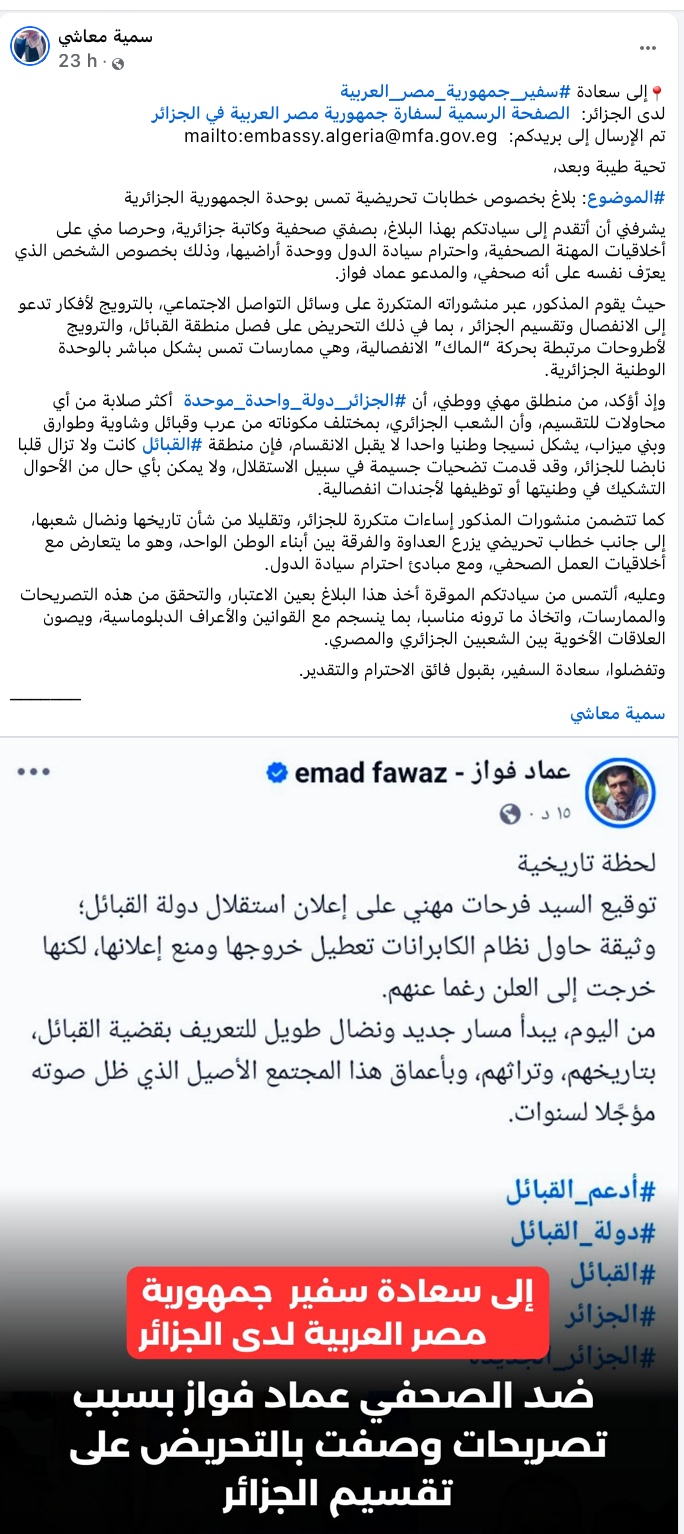 في ذات السياق، عمد الكابرانات إلى دفع عدد من أزلامهم لتقديم بلاغات رسمية ضد "العمدة" لدى سفارة مصر في الجزائر، متهمين إياه بالتحريض على الانفصال والإضرار بوحدة الجزائر!.. قراءة سريعة للبلاغ تكشف حجم الهلع والخوف الذي بات يتملك هذا النظام: صفحات مليئة بالاتهامات المبالغ فيها، تحذيرات، وادعاءات غير دقيقة، وكأن كشف الحقائق أصبح جريمة كبرى.