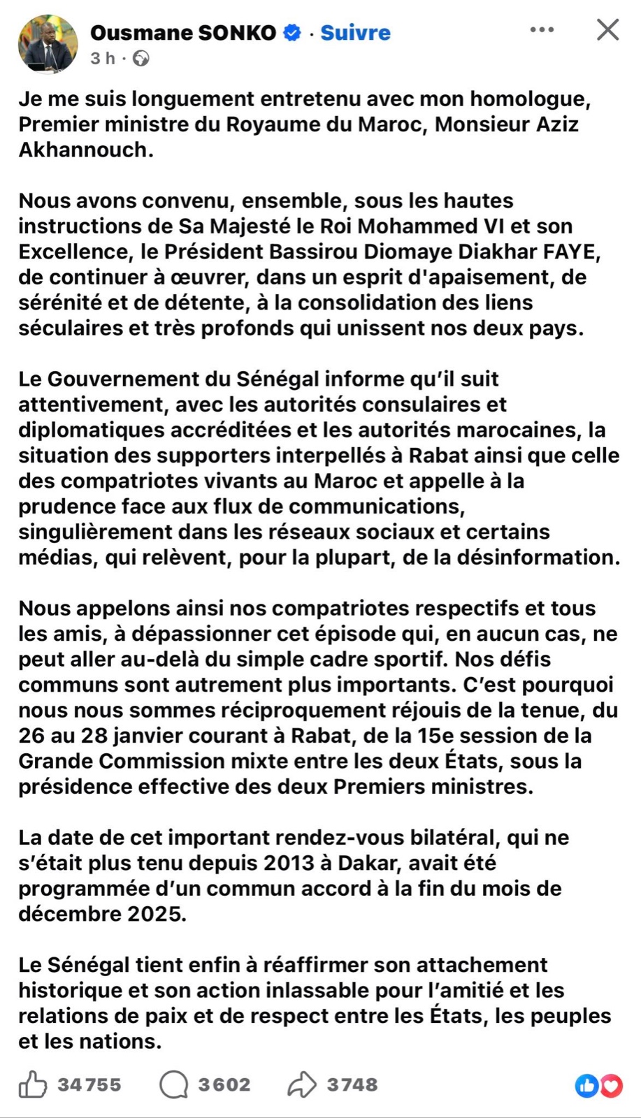 أما فيما يتعلق بالأحداث التي أعقبت اللقاء الرياضي (نهائي الكان)، شدد الوزير الأول السنغالي على أن حكومته تتابع عن كثب، بتنسيق مع السلطات القنصلية والدبلوماسية المعتمدة والسلطات المغربية، وضعية المشجعين السنغاليين الذين تم توقيفهم بالرباط، إلى جانب أوضاع أفراد الجالية السنغالية المقيمة بالمغرب، داعيًا إلى التحلي باليقظة وعدم الانسياق وراء ما وصفه بحملات التضليل التي انتشرت على نطاق واسع عبر وسائل التواصل الاجتماعي وبعض المنابر الإعلامية.