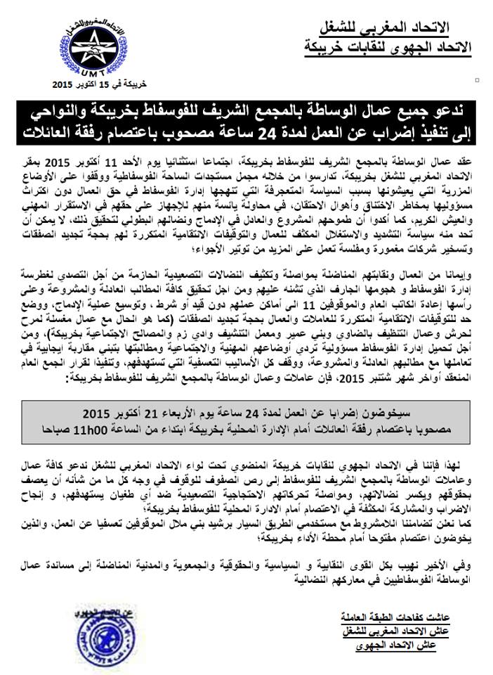 وإيمانا من العمال ونقابتهم المنضوية تحت لواء الإتحاد المغربي للشغل ، بضرورة مواصلة وتكثيف النضالات التصعيدية الحازمة من أجل التصدي لما وصفوه بـ "غطرسة " إدارة الفوسفاط و هجومها الجارف الذي تشنه عليهم ومن اجل تحقيق كافة المطالب العادلة والمشروعة وعلى رأسها إعادة الكاتب العام والموقوفين 11 الى أماكن عملهم دون قيد أو شرط ، وتوسيع عملية الإدماج، ووضع حد للتوقيفات الانتقامية المتكررة للعاملات والعمال بحجة تجديد الصفقات (كما هو الحال مع عمال مغسلة لمرح لحرش وعمال التنظيف بالضاوي وبني عمير ومعمل التنشيف وادي زم والمصالح الاجتماعية بخريبكة)، ومن أجل تحميل إدارة الفوسفاط مسؤولية تردي أوضاعهم المهنية والاجتماعية ومطالبتها بتبني مقاربة ايجابية في تعاملها مع مطالبهم العادلة والمشروعة، ووقف كل الأساليب التعسفية التي تستهدفهم، وتنفيذا لقرار الجمع العام المنعقد أواخر شهر شتنبر 2015، فإن عاملات وعمال الوساطة بالمجمع الشريف للفوسفاط بخريبكة سيخوضون إضرابا عن العمل لمدة 24 ساعة ، و ذلك بداية من الساعة 11 صباحا من يوم الأربعاء 21 أكتوبر 2015 ، مصحوبين بعائلاتهم، أمام مقر الإدارة المحلية بخريبكة .