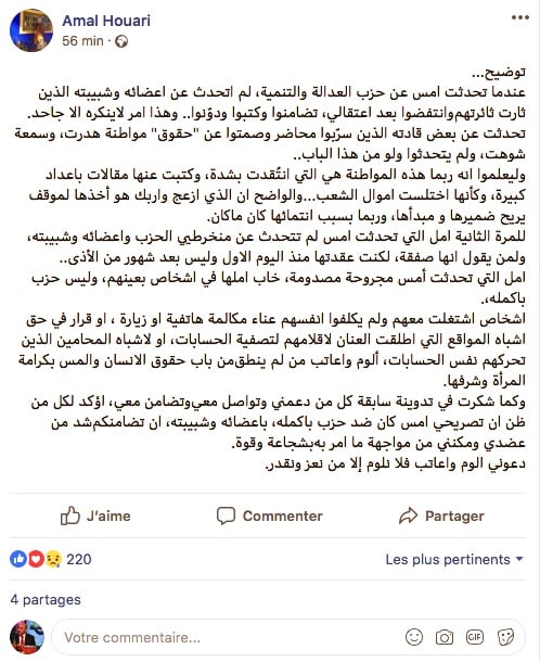 في توضيح للرأي العام، نشرت الصحافية أمل الهواري التي جرى متابعتها على خلفية ملف مدير نشر جريدة " أخبار اليوم " توفيق بوعشرين - نشرت - تدوينة جديدة على حسابها الخاص عبر الفيسبوك، أوضحت خلالها أنها : " عندما تحدثت أمس عن حزب العدالة والتنمية، لم اتحدث عن أعضائه و شبيبته الذين ثارت ثائرتهم وانتفضوا بعد اعتقالي، تضامنوا وكتبوا ودوّنوا.. وهذا أمر لا ينكره الا جاحد" قبل أن تؤكد : " تحدثت عن بعض قادته الذين سرّبوا محاضر وصمتوا عن "حقوق" مواطنة هدرت، وسمعة شوهت، ولم يتحدثوا ولو من هذا الباب. ".