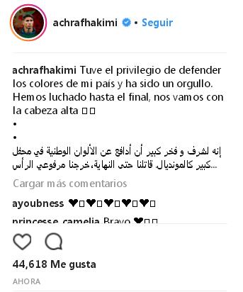 و قال حكيمي في تعليق مرفق بالصورة "إنه لشرف و فخر كبير أن أدافع عن الألوان الوطنية في محفل كبير كالمونديال. قاتلنا حتى النهاية،خرجنا مرفوعي الرأس...".