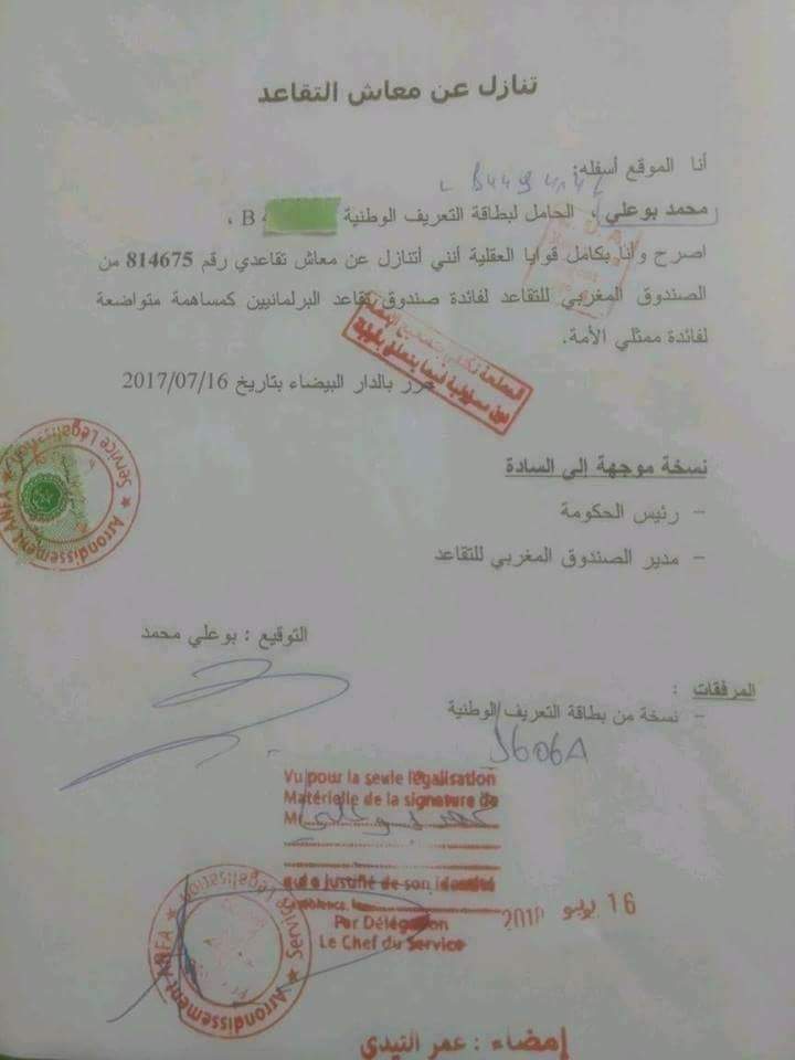 وكتب المواطن المذكور في وثيقة التنازل "أصرح أنني بكامل قواي العقلية أنني أتنازل عن تقاعدي من الصندوق المغربي للتقاعد لفائدة صندوق تقاعد البرلمانيين، كمساهمة متواضعة لفائدة ممثلي الأمة".