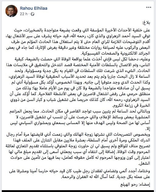 وجاء في تدوينة الهيلع : " على خلفية الأحداث الأخيرة المؤسفة التي وقعت بضيعة متواجدة بالصخيرات، حيث توفي السيد أحمد الزهراوي ( الشاب الأربعيني )، والذي كان، رحمه الله، قيد حياته يشرف على سير الأشغال بها، أقدم التوضيحات اللازمة للراي العام حتى لا يتم استغلال هذا الحادث المؤلم من طرف البعض والركوب عليه لصياغة روايات مختلقة وغير دقيقة بغرض الإثارة، كما جاء في بعض الجرائد اﻻلكترونية والصفحات الفيسبوكية ".