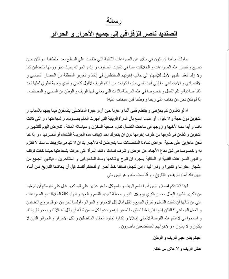 نشر لطفي الزفزافي، أخ ناصر، على موقع التواصل الاجتماعي فيسبوك، اليوم الاثنين ، رسالة موقعة من طرف شقيقه زعيم حراك الريف المحكوم ب 20 عاما سجنا ، تحمل عنوان "رسالة الصنديد ناصر الزفزافي الى جميع الأحرار و الحرائر".