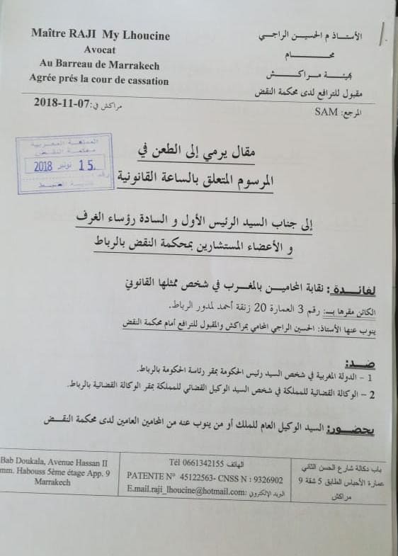 قررت نقابة المحامين بالمغرب عبر دعوى قضائية تكلف بها المحامي الحسين الراجي، الطعن في مرسوم الساعة القانونية للمملكة المغربية والمنشور بالجريدة الرسمية بتاريخ 27 أكتوبر 2018، أمام محكمة النقض.