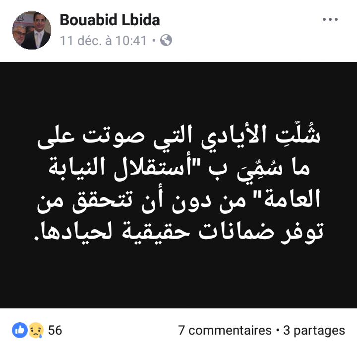 ونشر ذات البرلماني بوعبيد لبيدة تدوينة ثانية قال فيها :"شُلٌَتِ الأيادي التي صوتت على ما سُمٌِيَ ب "أستقلال النيابة العامة" من دون أن تتحقق من توفر ضمانات حقيقية لحيادها".