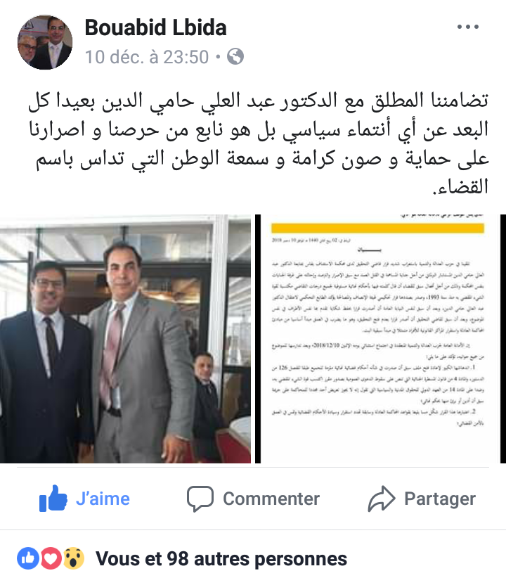 البرلماني لبيدة نشر تدوينة كتب فيها :" تضامننا المطلق مع الدكتور عبد العلي حامي الدين بعيدا كل البعد عن أي أنتماء سياسي بل هو نابع من حرصنا و اصرارنا على حماية و صون كرامة و سمعة الوطن التي تداس باسم القضاء".