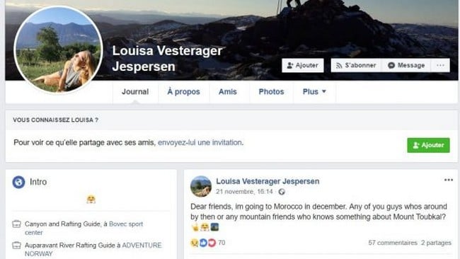 و كانت آخر تدوينة للضحية تتعلق بزياتها المرتقبة إلى المغرب آنذاك، حيث كتبت على صفحتها بالفايسبوك قبل شهر، :""انا ذاهبة الى المغرب في شهر دجنبر.. أيّ من الاصدقاء والشباب وعشاق الجبل لديه معلومات عن جبل توبقال...".