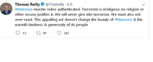 وختم السفير البريطاني كلامه بالتأكيد على أن هذا العمل الذي وصفه بالمروّع لن يسيء لصورة المغرب كبلد جميل ذو شعب كريم و ودود ، حسب تعبيره.