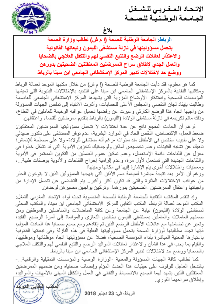 وإذ تتقدم المكاتب النقابية للجامعة الوطنية للصحة المنضوية تحت لواء الإتحاد المغربي للشغل: المكتب الموحد لعمالة الرباط، المكتب النقابي للمركز الاستشفائي الجامعي ابن سينا، والمكتب المحلي لمستشفى الولادة (الليمون) نيابة عن الجامعة وعن كافة المناضلات والمناضلين والموظفين ومن ضمنهم العاملات والعاملين بمستشفى الليمون بخالص التعازي والمواساة إلى أسرة الرضيع الفقيد، وتعبر عن تضامنها مع عائلات الأطفال الرضع الذين تم إنقاذهم ومع جميع ضحايا هذا الحادث المؤلم، فإنها تجدد مطالبتها لوزارة الصحة بتحمل مسؤولييتها الفعلية في هذه النازلة وفي تبعاتها القانونية باعتبارها المعنية المباشرة بأداء المؤسسة الصحية، فضلا عن مسؤوليتها اتجاه موظفاتها وموظفيها، والقيام بما يجب في هذا الشأن والاعتذار لعائلات المواليد الرضع والتتبع النفسي لهم والتكفل العلاجي بالضحايا ووضع حد لاختلالات تدبير المركز الإستشفائي الجامعي ابن سينا بالرباط.