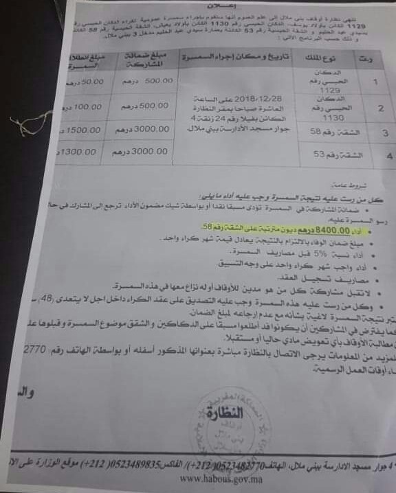 استغرب عدد من المواطنين من إعلان لنظارة الأوقاف ببني ملال التابعة لوزارة الأوقاف والشؤون الإسلامية ، تعلن فيه عن سمسرة دكانين وشقتين باقليم بني ملال يوم 28/12/2018 ، وذلك بمقر نظارة الاوقاف بنفس المدينة.