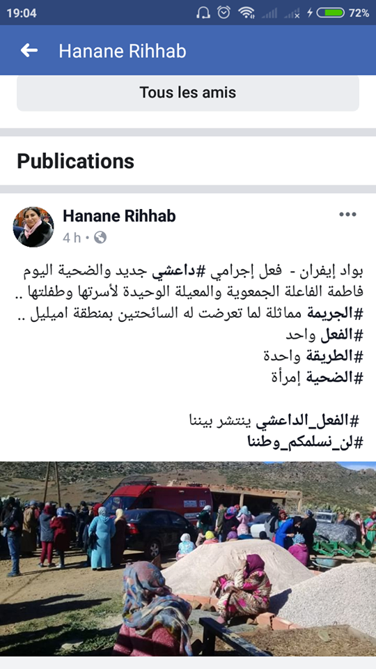 وجاء في تدوينة رحاب: "بواد إيفران - فعل إجرامي #داعشي جديد والضحية اليوم فاطمة الفاعلة الجمعوية والمعيلة الوحيدة لأسرتها وطفلتها ..