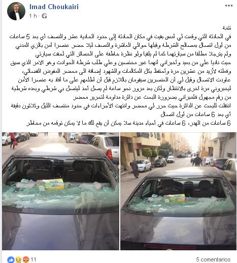 وعاد المتحدث لينشر صباح اليوم السبت تفاصيل جديدة من خلال تدوينة أخرى ، حيث قال "في الحادثة التي وقعت لي أمس بقيت في مكان الحادثة إلى حدود الحادية عشر والنصف أي بعد 5 ساعات من أول اتصال بمصالح الشرطة وقبلها حوالي العاشرة والنصف ليلا". وأضاف "حضر عنصرا أمن بالزي المدني ولم يترجلا مطلقا من سيارتهما كما لم يلقيا ولو نظرة خاطفة على الخسائر التي لحقت سيارتي ، حيث ناديا علي من بعيد وأخبراني أنهما غير مختصين وعلي طلب شرطة الحوادث وهو الامر الذي سبق وفعلته لأزيد من عشرين مرة وأحتفظ بكل المكالمات والشهود إضافة الى محضر المفوض القضائي".