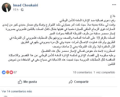 أكدت المديرية العامة للأمن الوطني أن الحادثة التي ادعى المسمى عماد شقيري أنه تعرض لها بمدينة سلا لم تكن نهائيا قضية زجرية تدخل في اختصاص شرطة حوادث السير، ولم تكن مطبوعة بالاستعجال الذي هو جوهر تدخل شرطة النجدة.