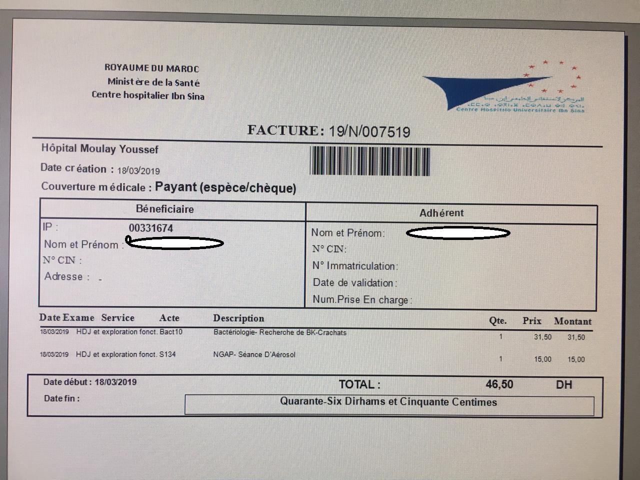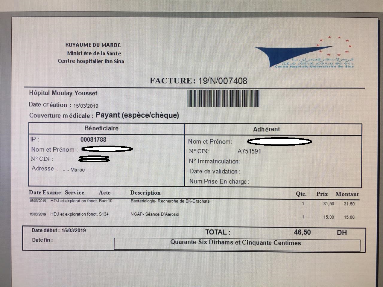 توصل موقع "أخبارنا" بوثائق، عبارة عن فاتورتين تحملان تاريخ الأسبوع الماضي، وتثبتان استمرار مستشفى "مولاي يوسف للأمراض الصدرية " بمدينة الرباط، في فرض مالية على مرضى داء السل.