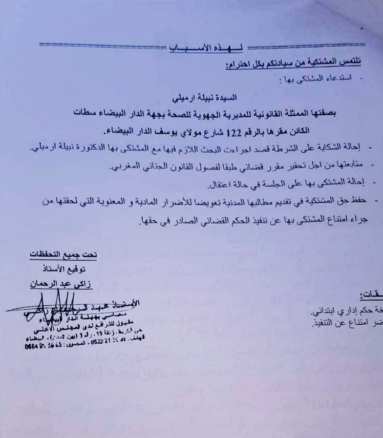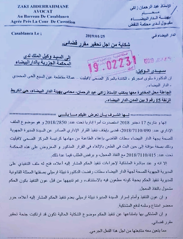 بعد أن أصدرت المحكمة الإدارية بمدينة الدار البيضاء، في الـ17 دجنبر 2018، قرارا إداريا يقضي بإلغاء قرار إعفاء "سلوى أمجركو"، الطبيبة الرئيسية للمركز الصحي "لافيليت"، الذي صدرته في حقها المديرة الجهوية للصحة بجهة البيضاء - سطات، بعد أن طالبت المشتكية من المسؤولة الجهوية المذكورة، فتح تحقيق حول اختفاء مادة الأنسولين، أفادت مصادر مطلعة على الملف، أن الطبيبة سلوى باشرت إجراءات تنفيذ الحكم المذكور أعلاه، غير أن المديرة الجهوية رفضت أول الأمر تنفيذ الحكم بحجة أن القرار مطعون فيه بالاستئناف.