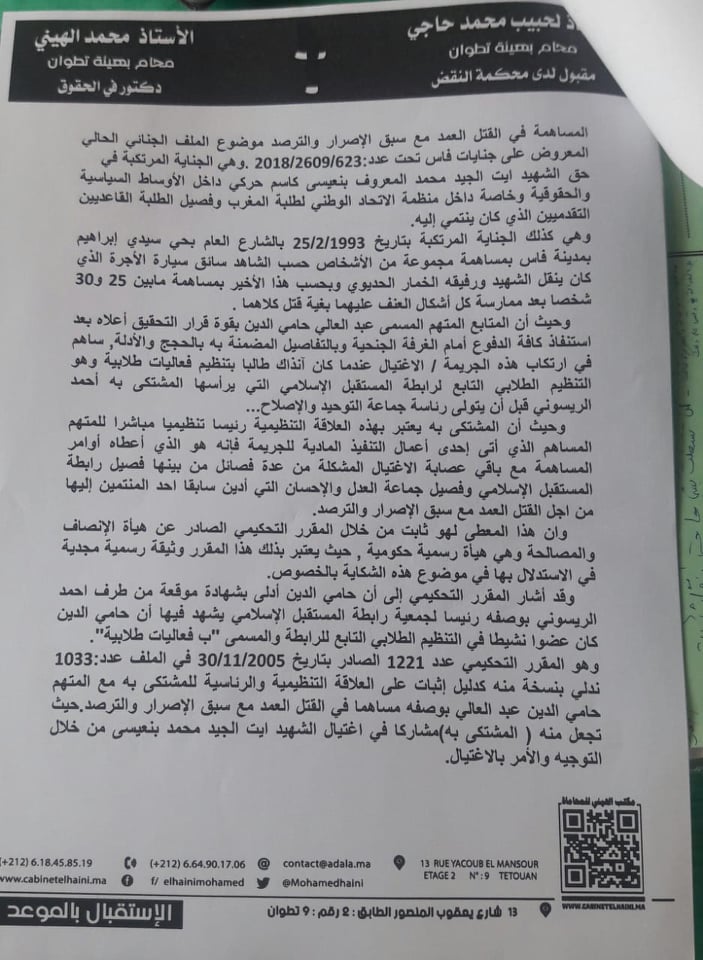 وورد في الشكاية التي تتوفر "أخبارنا" على نسخة منها، أنها قدمت لصالح "ذوي حقوق الشهيد آيت الجيد محمد المعروف باسم بنعيسى السادة : ايت الجيد الحسن وايت الجيد إبراهيم، وجمعية الدفاع عن حقوق الإنسان في شخص ممثلها القانوني، ومؤسسة ايت الجيد بنعيسى للحياة ومناهضة العنف في شخص ممثلها القانوني".