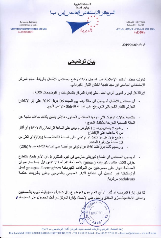 وشددت إدارة المركز الاستشفائي الجامعي ابن سينا على أن مستشفى الأطفال لم يسجل أي انقطاع كهربائي خارجي في اليوم المذكور، بل أن الأمر يتعلق بانقطاع جزئي لثلاث مقابس كهربائية بالمصلحة دام لمدة 7 دقائق قبل إصلاحه، مسجلة أن المصلحة تتوفر على مجموعتين من المولدات الكهربائية تعمل أوتوماتيكيا فور تسجيل أي انقطاع للتيار العمومي والخارجي وعلى بطاريات عاكسة مركزية.
