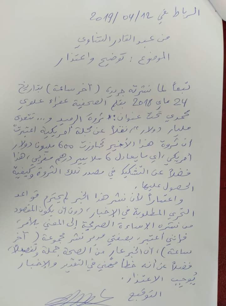 وجاء تنازل وزير الدولة، بعد الإعتذار المكتوب(تحصل موقع أخبارنا على نسخة منه) الذي قدمه "عبد القادر الشاوي" اليساري والمعتقل السياسي السابق، الذي كان يشغل مهمة مدير اليومية قبل أن تتوقف عن الصدور.