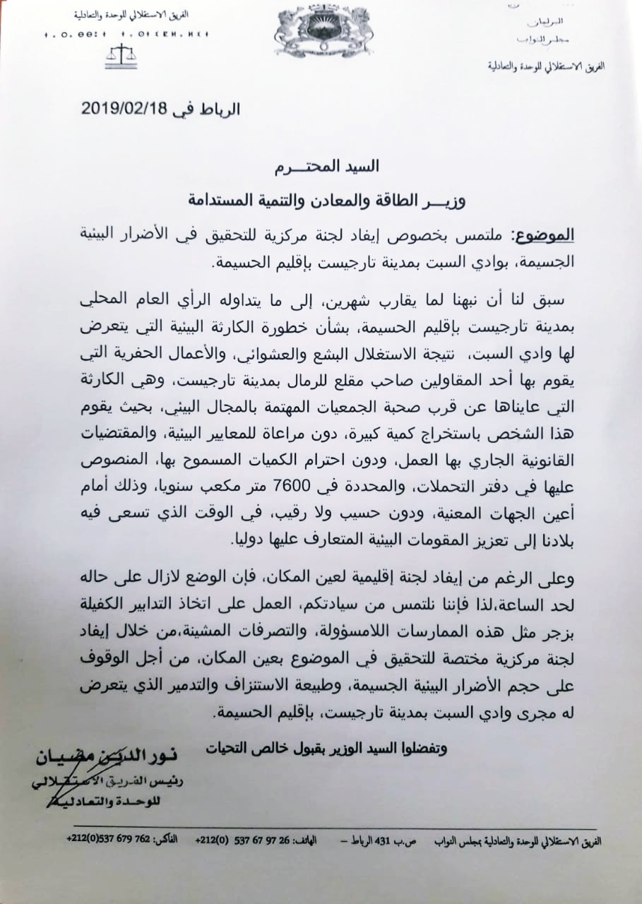 علمنا في موقع "أخبارنا" وفق مصادر مؤكدة، أن طفلا يبلغ من العمر 14 سنة، قد لقي حتفه قبل لحظات بـ "واد السبت" بمدينة تارجيست التابعة ترابيا لإقليم الحسيمة، وذلك بعد سقوطه في حفرة مقلع للرمال، يوجد وسط الوادي، ويستغله نافذ، سبق أن صدر في حقه تقريرا أسودا، عقب ملتمس تقدم به الفريق الاستقلالي إلى وزير الطاقة والمعادن، طالب من خلاله بضرورة إيفاد لجنة مركزية، للوقوف على حجم الأضرار التي تتعرض لها المنطقة المذكورة جراء الاستغلال البشع وغير القانوني من قبل رب المقلع (الوثيقة).