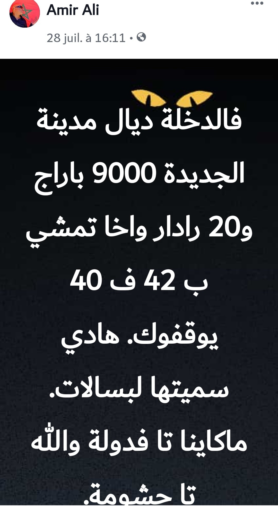 خرج الفنان المغربي أمير علي بتدوينة على حسابه الفايسبوكي، إختلف متتبعوه في قراءتها. أمير والذي حل بعاصمة دكالة للمشاركة في حفل فني في إطار مهرجان الشواطئ، الأحد الماضي. بحيث كتب على صفحته وبنبرة تبدو غاضبة: "فالدخلة ديال مدينة الجديدة 9000 باراج و20 رادار واخا تمشي ب 42 ف 40 يوقفوك. هادي سميتها لبسالات. ماكاينا تا فدولة والله تا حشومة."