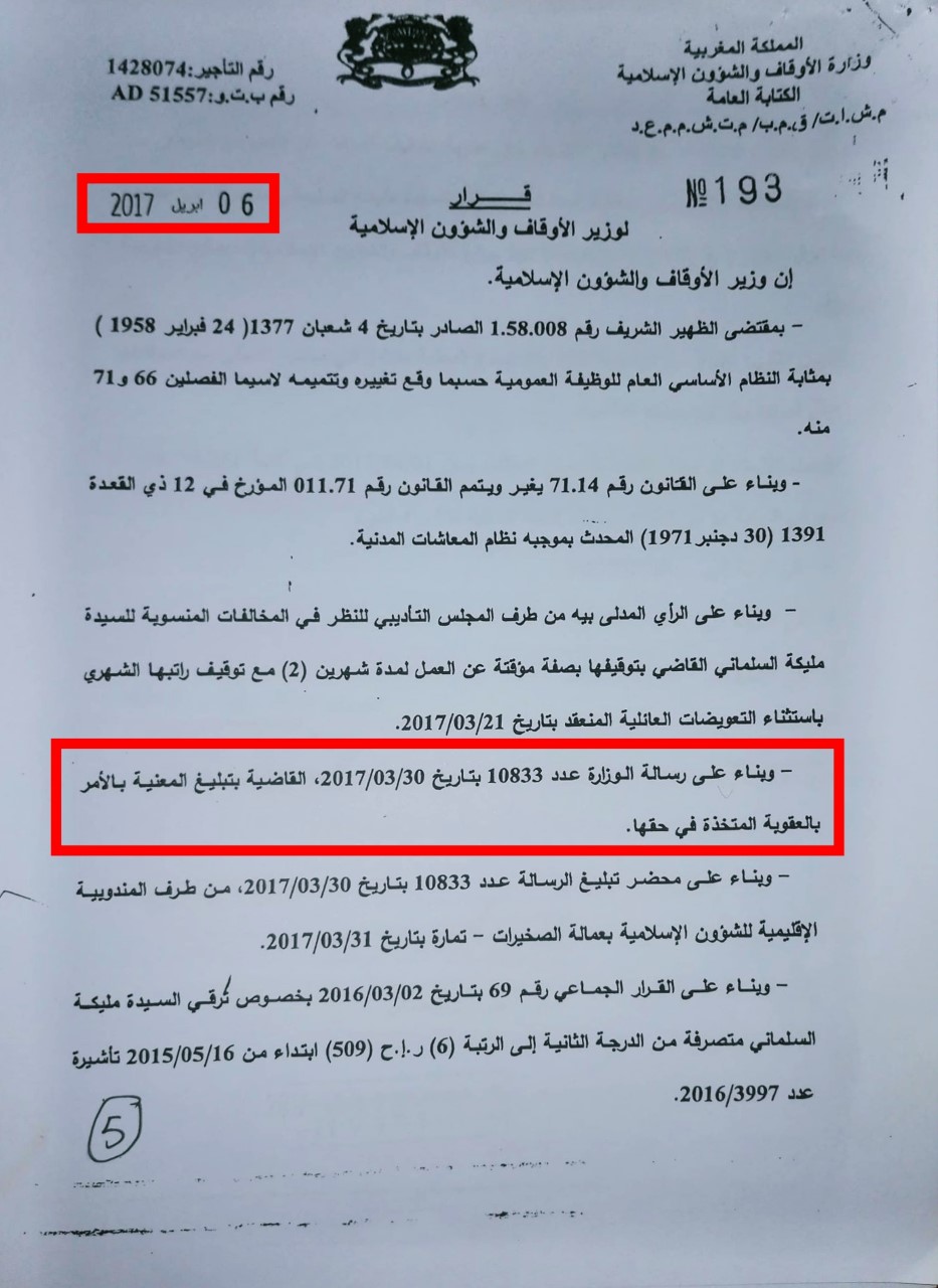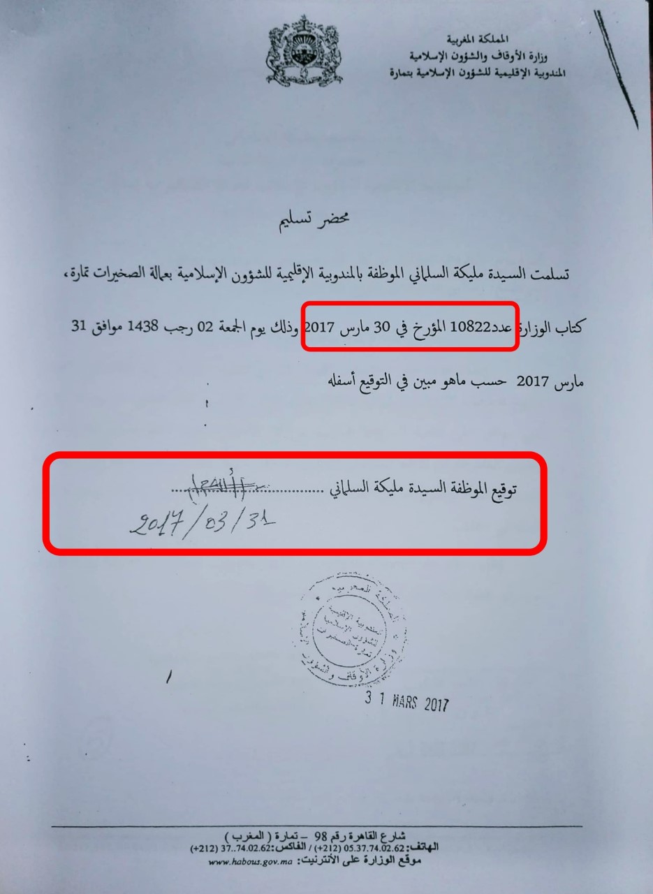 بالوثائق : السلماني تفجر فضيحة "تزوير" في وجه وزارة الأوقاف وتتهم مسؤولا كبيرا بها بالتواطؤ مع مغتصبها البرلماني عاريف (فيديو)
