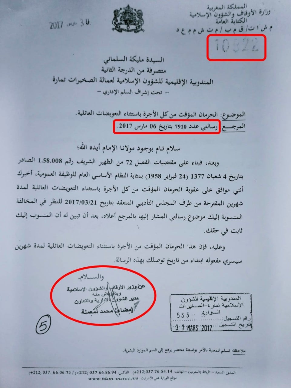 تفاصيل مثيرة جدا، واتهامات خطيرة، تلك التي وجهتها موظفة الأوقاف، مليكة السلماني، لمسؤول رفيع المستوى بوزارة الأوقاف، قالت أنه عمد إلى تزوير قرار إداري يقضي بحرمانها من راتبها الشهري، إرضاء لمغتصبها، البرلماني حسن عاريف، وفق تصريحها.