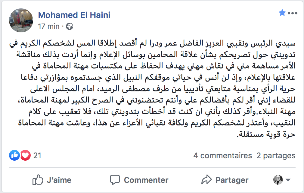 عقب نشره تدوينة عبر حسابه الشخصي بالفيسبوك، والتي جاءت كرد على بيان نقيب هيئة المحامين بالدار البيضاء، الذي منع من خلاله المحامين من الإدلاء بآرائهم لوسائل الإعلام، وعدم الخوض في بعض الأمور التي تتعلق بالمتقاضين باعتبارها سرا من أسرار المهنة، عاد المحامي "محمد الهيني" ليعتذر عن منشوره السابق، عبر تدوينة جديدة نشرها عبر حسابه الفيسبوكي.