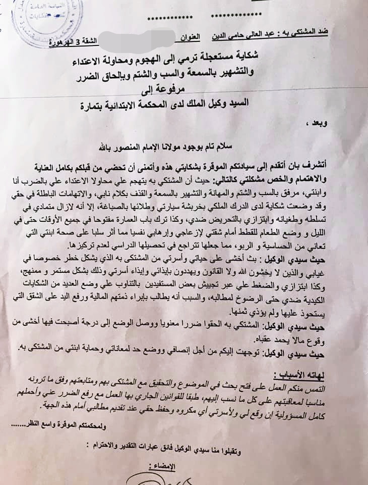 وبالرجوع إلى كواليس هذا الحادث الذي اهتز على إثره الرأي العام بمدينة الهرهورة، ضواحي تمارة، خلال الأسابيع القليلة الماضية، فقد تقدم شخص يقطن بإحدى التجمعات السكنية بالجماعة المذكورة، بشكاية إلى السيد وكيل الملك بابتدائية تمارة، يتهم فيها عبد العالي حامي الدين، القيادي بحزب العدالة والتنمية، الذي يسكن بجواره، بالتهجم عليه بمعية ابنته ومحاولة الاعتداء عليه بالضرب، مع السب والشتم، والتحريض عليه، عبر وضع شكايات كيدية ضده، من أجل إجباره على الرضوخ إلى مطالبه المتمثلة في إبراء ذمتهم المالية ورفع اليد على الشقق التي يستحوذ عليها ولم يؤدي ثمنها، حسب بما جاء في الشكاية التي توصل موقع "أخبارنا" بنسخة منها (الوثيقة):