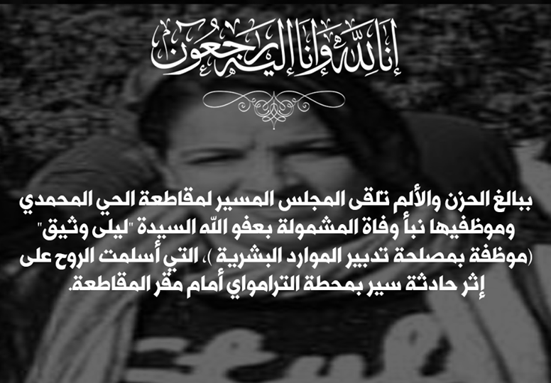 وجاء في تدوينة بالصفحة الرسمية لمقاطعة الحي المحمدي على الفيسبوك "ببالغ الحزن والألم تلقى المجلس المسير لمقاطعة الحي المحمدي وموظفيها نبأ وفاة المشمولة بعفو الله السيدة “ليلى وثيق” (موظفة بمصلحة تدبير الموارد البشرية )، التي أسلمت الروح على إثر حادثة سير بمحطة الترامواي أمام مقر المقاطعة".