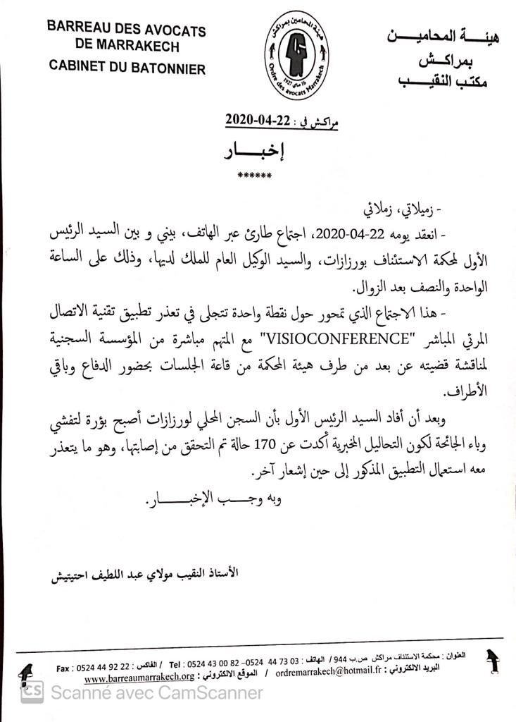 علمت أخبارنا المغربية أن المصابين بسجن ورزازات قاربوا 170 إصابة مؤكدة بفيروس كورونا المستجد، وذلك وفقا لما ورد في إخبار صادر عن مكتب نقيب هيئة المحامين بمراكش، اليوم الأربعاء 22 أبريل، والذي أشار لتحول السجن المحلي لورزازات لبؤرة لتفشي الوباء، كون التحاليل المخبرية أكدت أن 170 حالة تم التحقق من إصابتها بكوفيد 19.