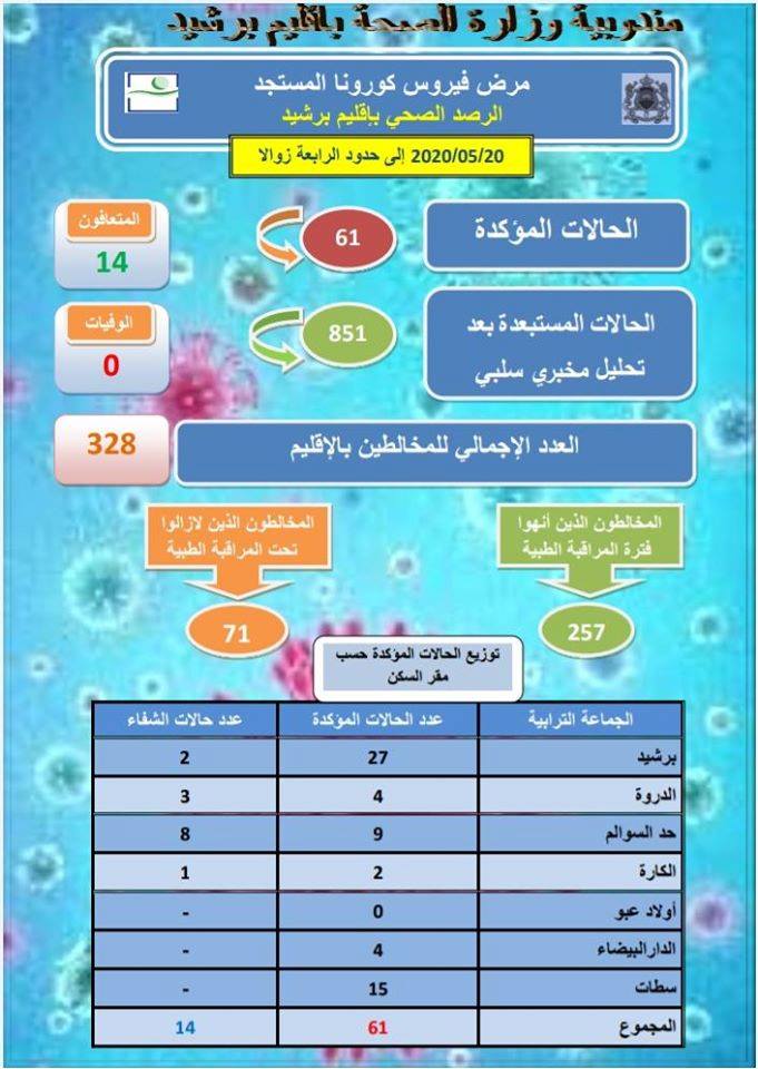 وفي مايلي الحالة الوبائية الاجمالية باقليم برشيد الى حدود الساعة الرابعة من يومه الاربعاء 20/05/2020.