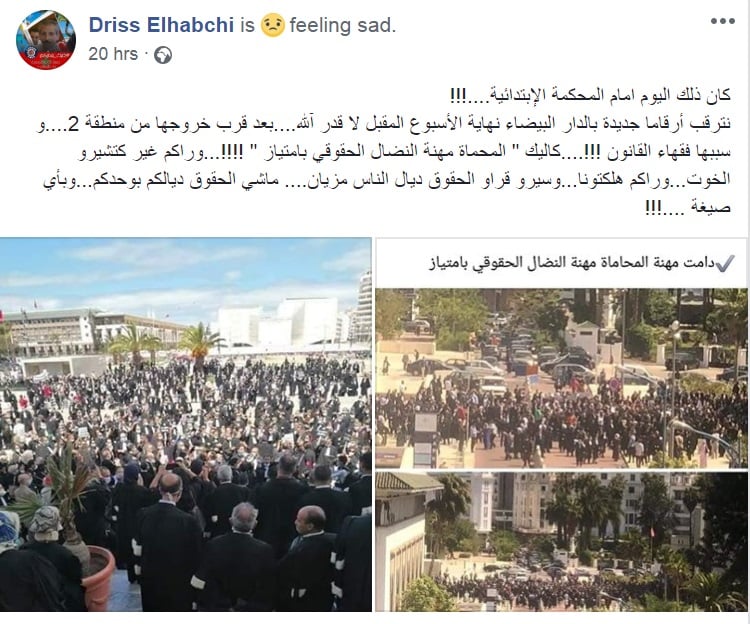 تناقلت عدد من الصفحات الفايسبوكية يوم أمس صورا للمظاهرة التي نظمها المحامون مؤازرة لزميل لهم تعرض لإفراغ مكتبه من طرف السلطات المحلية بالدارالبيضاء، وتم تذييل الصور بالعديد من التعليقات الساخرة من قبيل ،،، "هل المحامون محميون من عدوى فيروس كورونا" نظرا لعدم احترام أصحاب البذلة السوداء للتباعد الجسدي الضروري للوقاية من فيروس كورونا.