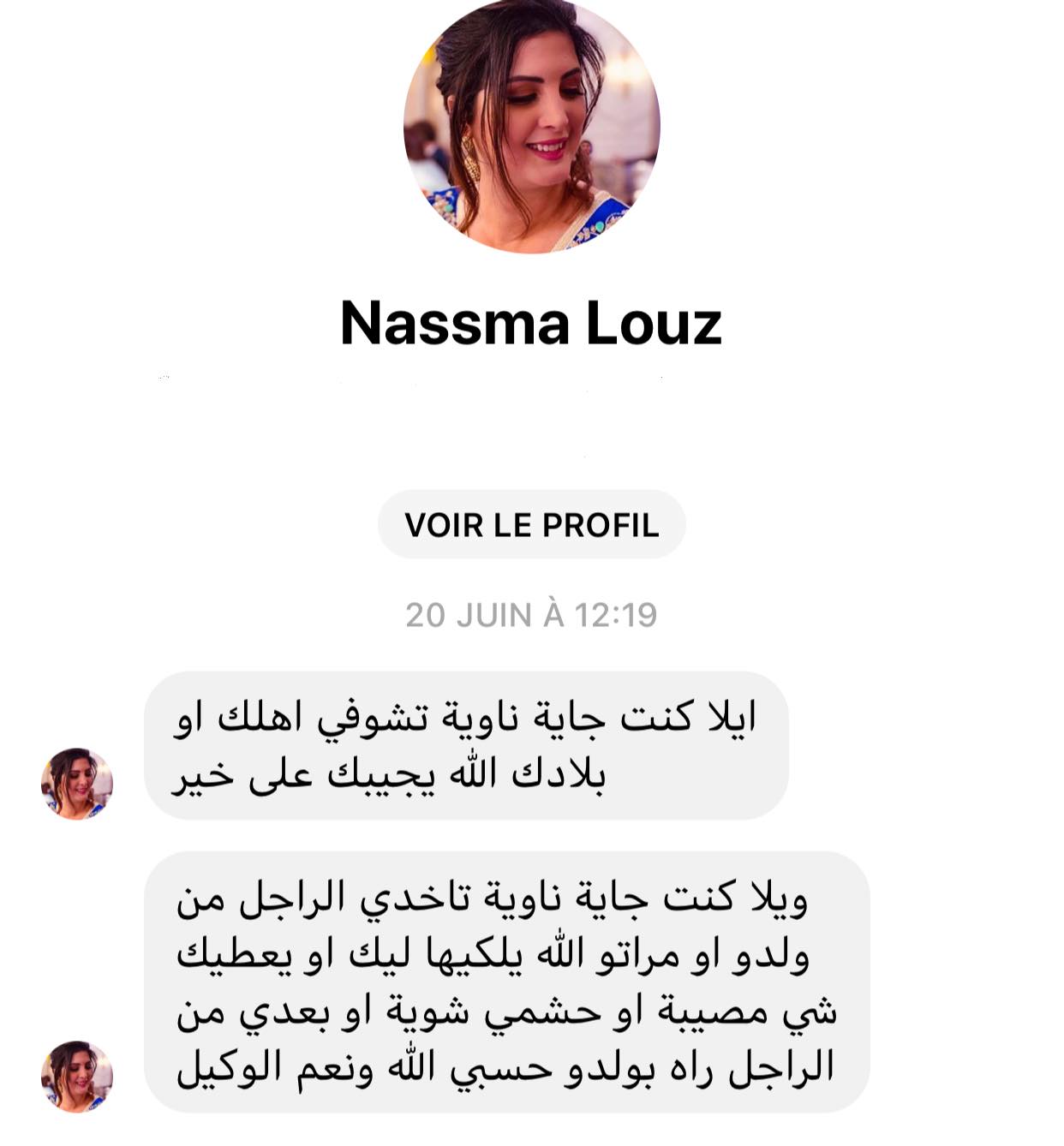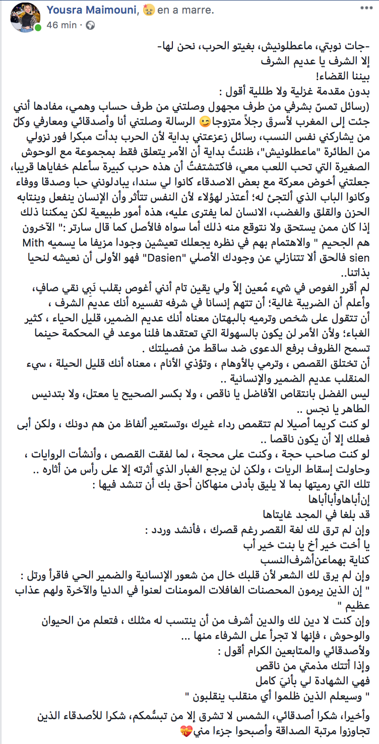 رسائل تمسّ بشرفي من طرف مجهول وصلتني من طرف حساب وهمي، مفادها أنني جئت إلى المغرب لأسرقَ رجلاً متزوجا الرسالة وصلتني أنا وأصدقائي ومعارفي وكلّ من يشاركني نفس النسب، رسائل زعزعتني بداية لأن الحرب بدأت مبكرا فور نزولي من الطائرة "ما عطلونيش"، ظننتُ بداية أن الأمر يتعلق فقط بمجموعة مع الوحوش الصغيرة التي تحب اللعب معي، فاكتشتفتُ أن هذه حرب كبيرة سأعلم خفاياها قريبا، جعلتني أخوض معركة مع بعض الأصدقاء كانوا لي سندا، يبادلونني حبا وصدقا ووفاء، وكانوا الباب الذي ألتجئ له؛ أعتذر لهؤلاء لأن النفس تتأثر وأن الإنسان ينفعل وينتابه الحزن والقلق والغضب، الانسان لما يفترى عليه، هذه أمور طبيعية لكن يمكننا ذلك إذا كان ممن يستحق ولا نتوقع منه ذلك أما سواه فالأصل كما قال سارتر :" الآخرون هم الجحيم " والاهتمام بهم في نظره يجعلك تعيشين وجودا مزيفا ما يسميه Mith sien فالحق ألا تتنازلي عن وجودك الأصلي "Dasien" فهو الأولى أن نعيشه لنحيا بذاتنا..