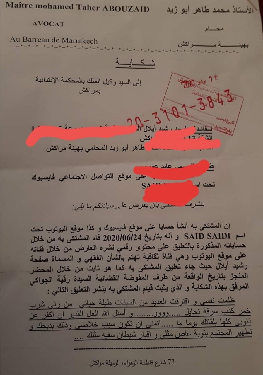 تقدم رشيد أيلال صاحب كتاب "البخاري نهاية أسطورة" المثير للجدل، اليوم الخميس بشكاية لوكيل الملك بابتدائية مراكش على يد محاميه الحقوقي محمد طاهر أبوزيد، من هيئة مراكش، وكشفت الشكاية التي توصلت أخبارنا بنسخة منها، أن المشتكي به (ع.ع) أنشأ حسابا على موقع فايسبوك وكذا موقع يوتيوب تحت اسم (س.س)، وأنه بتاريخ 24 يونيو الجاري، قام المشتكى به من خلال حساباته المذكورة بالتعليق على محتوى رقمي نشره أيلال من خلال قناته، وهي قناة ثقافية تهتم بالشأن الفقهي، حيث جاء تعليق المشتكى به كما هو ثابت في المحضر المنجز بتاريخ الواقعة من طرف مفوضة قضائية، يثبت قيام المشتكى به بنشر التعليق التالي: "ظلمت نفسي واقترفت العديد من السيئات طيلة حياتي من زنى وشرب وخمر وكذب وسرقة وتحايل وووو... وأسأل الله العلي القدير أن أكفر عن ذنوبي كلها بلقائك يوما ما... أتمنى أن تكون سبب خلاصي وذلك بذبحك وتطهير المجتمع بتوبة عاص مثلي وإقبار شيطان سفيه مثلك..."