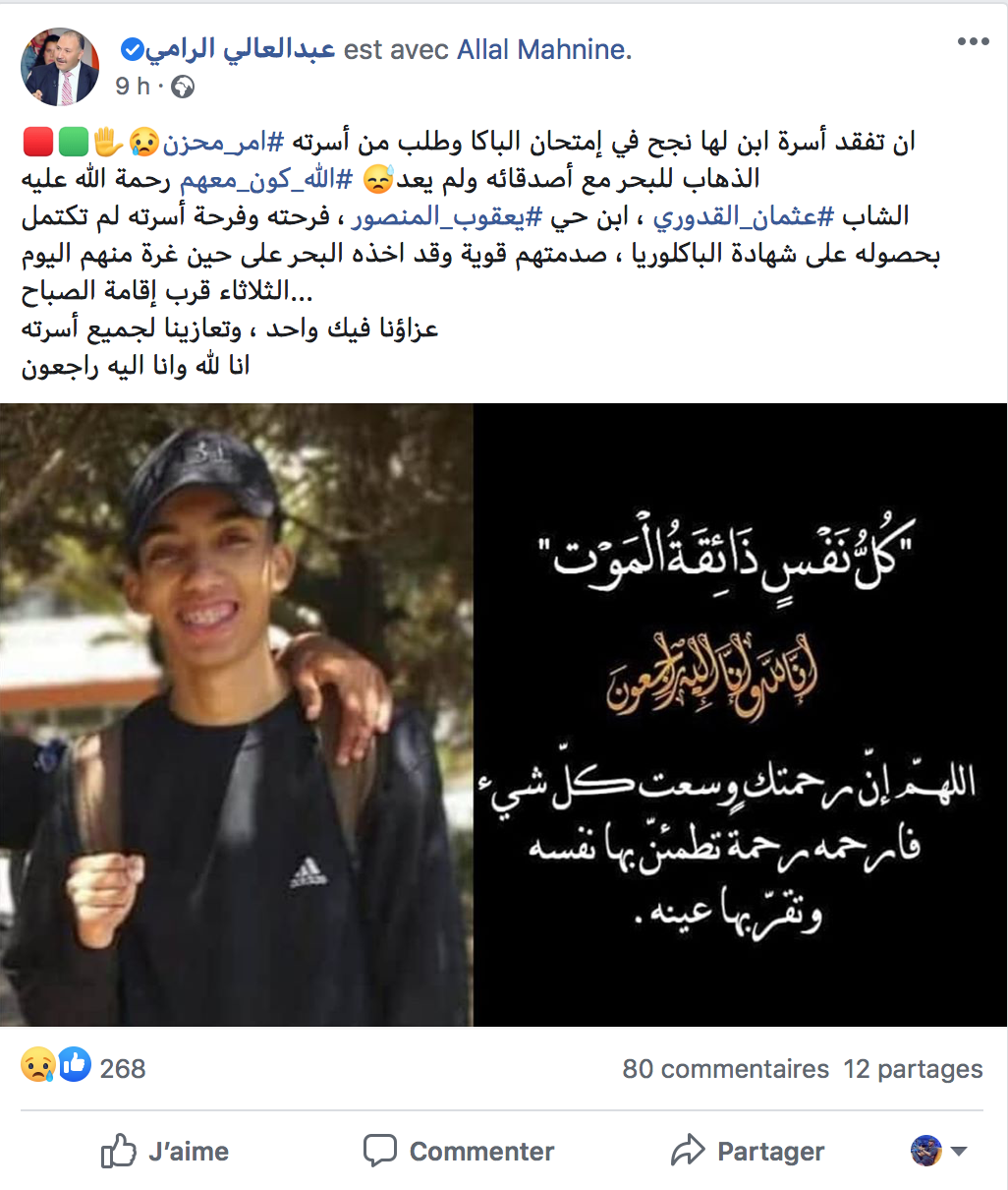 لم تكن أسرة التلميذ "عثمان القدوري" تتخيل أن فرحة حصول ابنها على شهادة "الباك" بعد سنوات من الانتظار، ستتحول إلى مأساة وفاجعة أليمة، ذلك ما حصل عشية أمس الثلاثاء، حينما اختار التلميذ المذكور التوجه إلى الشاطئ المتواجد قبالة حي يعقوب المنصور بالرباط، بمعية أصدقائه، من أجل الاستجمام والاحتفال بفرحة حصوله على شهادة الباكلوريا، قبل أن يدركه القدر، حيث لفظ أنفاسه الأخيرة، بعد أن غرق وهو يسبح بالشاطئ المذكور.