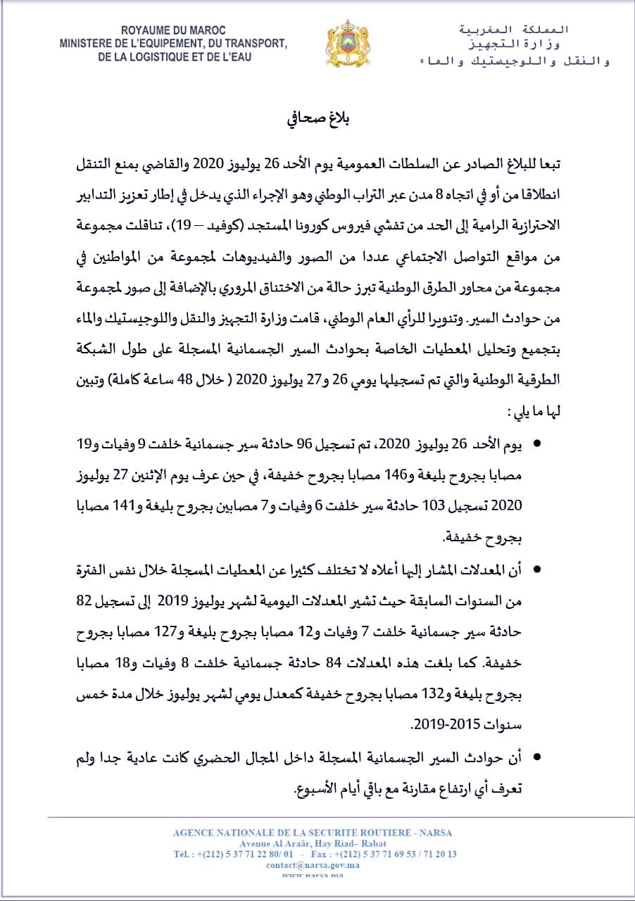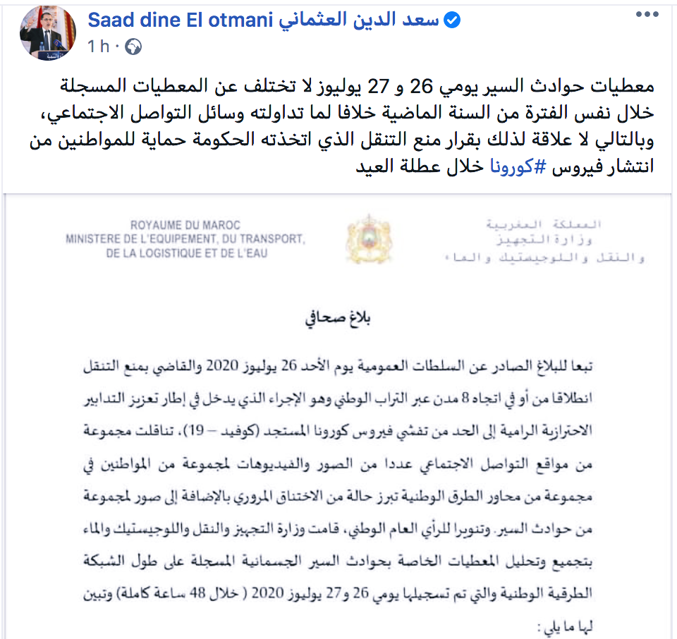 وارتباطا بالموضوع، نشر رئيس الحكومة عبر صفحته الرسمية على الفيسبوك، بلاغا لوزارة النقل، تضمن مقارنة بين الحوادث المسجلة في نفس الفترة من السنة الجارية والسنة الماضية، أرفقه بتدوينة جاء فيها: "معطيات حوادث السير يومي 26 و 27 يوليوز لا تختلف عن المعطيات المسجلة خلال نفس الفترة من السنة الماضية خلافا لما تداولته وسائل التواصل الاجتماعي، وبالتالي لا علاقة لذلك بقرار منع التنقل الذي اتخذته الحكومة حماية للمواطنين من انتشار فيروس كورونا خلال عطلة العيد".