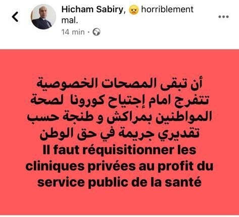 البرلماني نشر قبل قليل تدوينة على حائطه الفيسبوكي قال فيها :" أن تبقى المصحات الخصوصية تتفرج امام اجتياح كورونا لصحة المواطنين بمراكش وطنجة حسب تقديري جريمة في حق المواطن" ، مضيفا :" يجب وضع المصحات الخاصة رهن الخدمة العمومية للصحة".