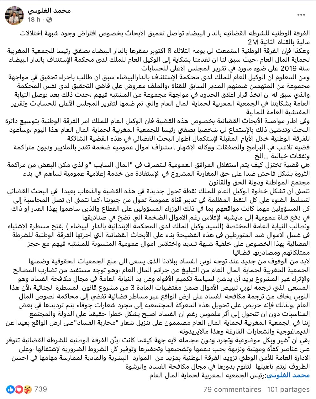 وفي إطار مواصلة الأبحاث القضائية بخصوص هذه القضية، أوضح "الغلوسي" أن: "الوكيل العام للملك أمر الفرقة الوطنية بتوسيع دائرة البحث وتدشين ذلك بالإستماع لي شخصيا بصفتي رئيسا للجمعية المغربية لحماية المال العام هذا اليوم، وسأعود للفرقة الوطنية خلال الأيام المقبلة لإستكمال أطوار البحث القضائي في هذه القضية الشائكة"، قبل أن يتابع قائلا: "قضية تلاعب في البرامج والصفقات ووكالة الإشهار، استنزاف أموال عمومية ضخمة تقدر بالملايير وديون متراكمة ونفقات خيالية …".