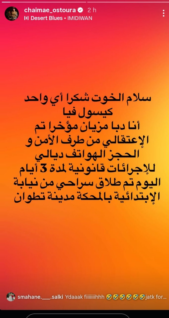 وقالت شيماء في رسالتها: "سلام الخوت، شكرا لأي واحد كيسول فيا، أنا دبا مزيان؛ مؤخرا تم اعتقالي من طرف الأمن، وحجزت هواتفي لمدة ثلاثة أيام بسبب إجراءات قانونية. اليوم أطلق سراحي من طرف النيابة الابتدائية بمحكمة تطوان".
