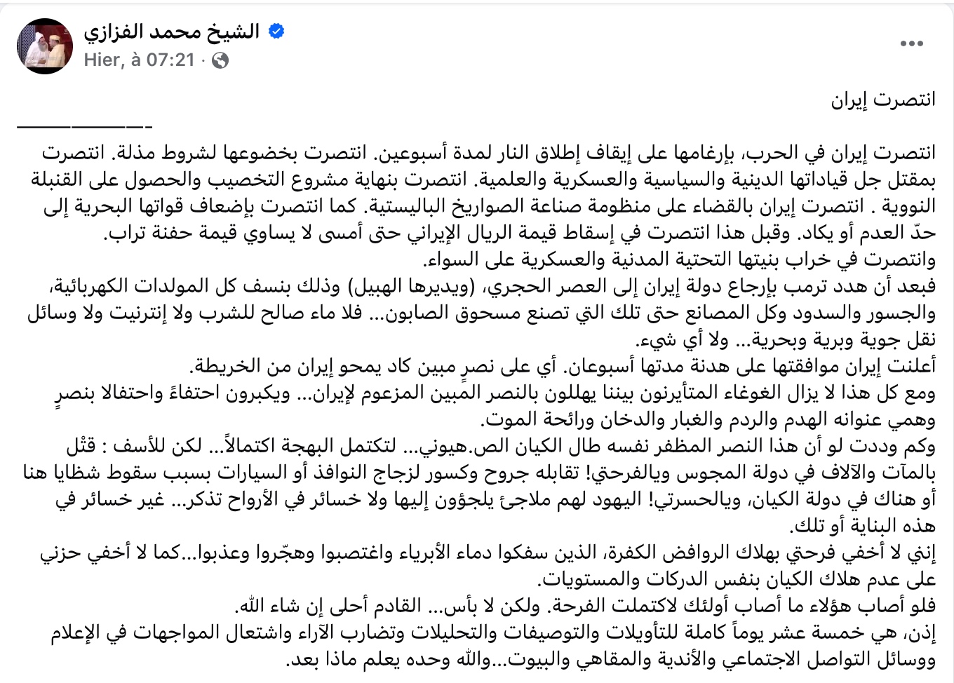 الفيزازي، وفي رسالة الساخرة نشرها عبر صفحته الرسمية على الفيسبوك، قلب معادلة الخطاب الإيراني رأساً على عقب، مقدماً "النصر" كما لو كان سلسلة من الهزائم المتتالية، بداية من القبول بوقف إطلاق النار بشروط وُصفت بالمذلة، إلى سقوط قيادات بارزة، وصولاً إلى تضرر مشاريع استراتيجية كبرى، على رأسها البرنامج النووي ومنظومة الصواريخ.