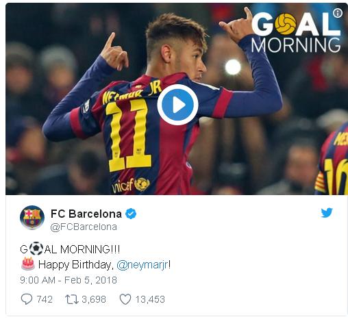 وبعث البارسا عبر حسابه على موقع تويتر بـ"كثير من التهاني" لنيمار، وأرفق الرسالة بمقطع فيديو يظهر فيها اللاعب البرازيلي بقميص الفريق الكاتالوني وهو يسدد هدفا في مرمى إلتشي في موسم 2014-2015.