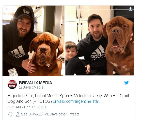 وفي هذا الصدد، ذكر موقع "ديلي ميل" أن نجم برشلونة، ليونيل ميسي، قضى عيد الحب برفقة "سنيورهلك" كلبه ذي الحجم الكبير، وأضاف أن ميسي نشر على حسابه الخاص في موقع التواصل الاجتماعي "إنستغرام" ثلاث صور برفقة كلبه صاحب اللون البني.
