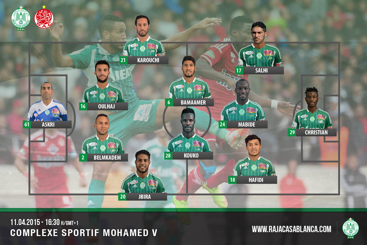 الرجاء البيضاوي : العسكري، جبيرة، الكاروشي، بلمقدم، أولحاج، مابيدي، كوكو، بامعمر، أوساكونا، حافيظي، الصالحي.